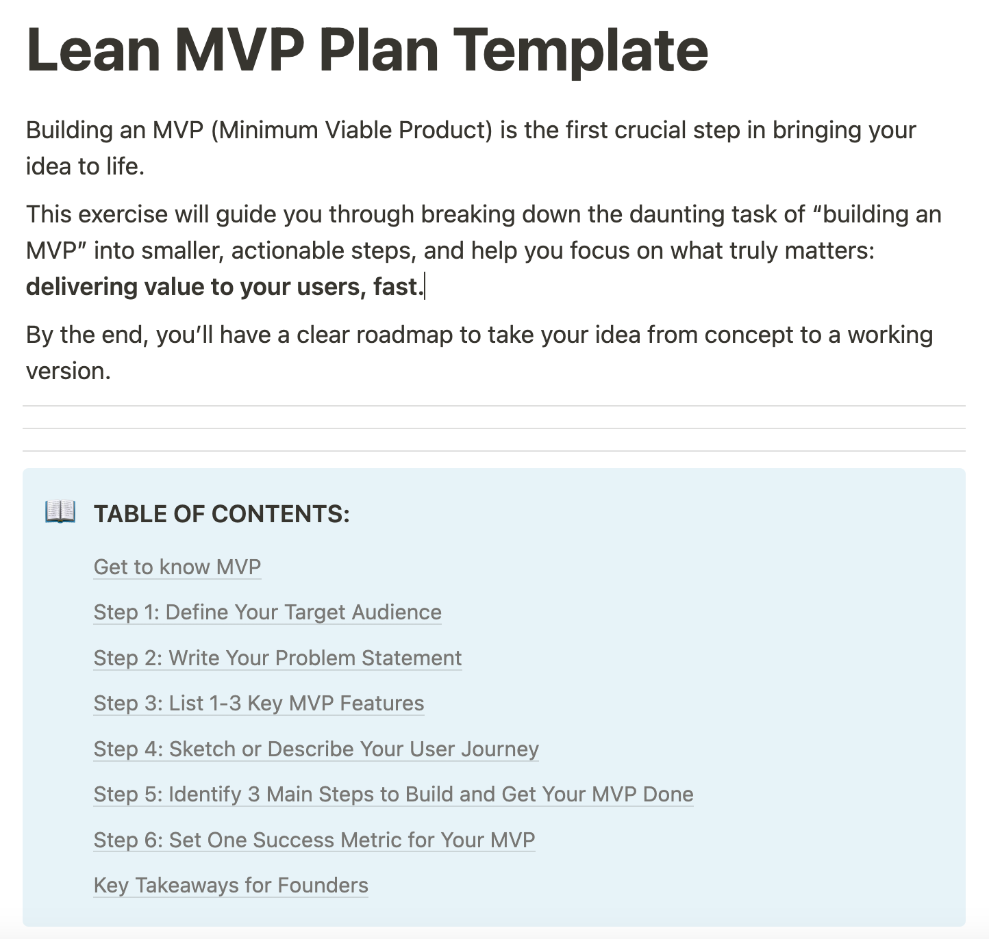 Now it’s your turn! Whether you’re building an app, a SaaS, or a tech product, we’ve created a Lean MVP Plan Template inspired by Cal AI’s success. This template acts as a step-by-step guide that will walk you through the exact process Zach and Blake used to build their MVP—helping you get your hands dirty and bring your vision to life.